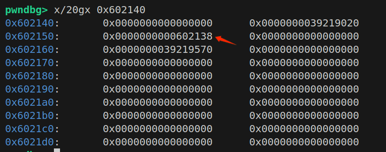 申请三个堆块,第一个堆块用于修改第二个堆块的内容,第二个堆块用来泄露链表头地址,第三个堆块用来记录链表头地址