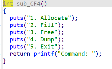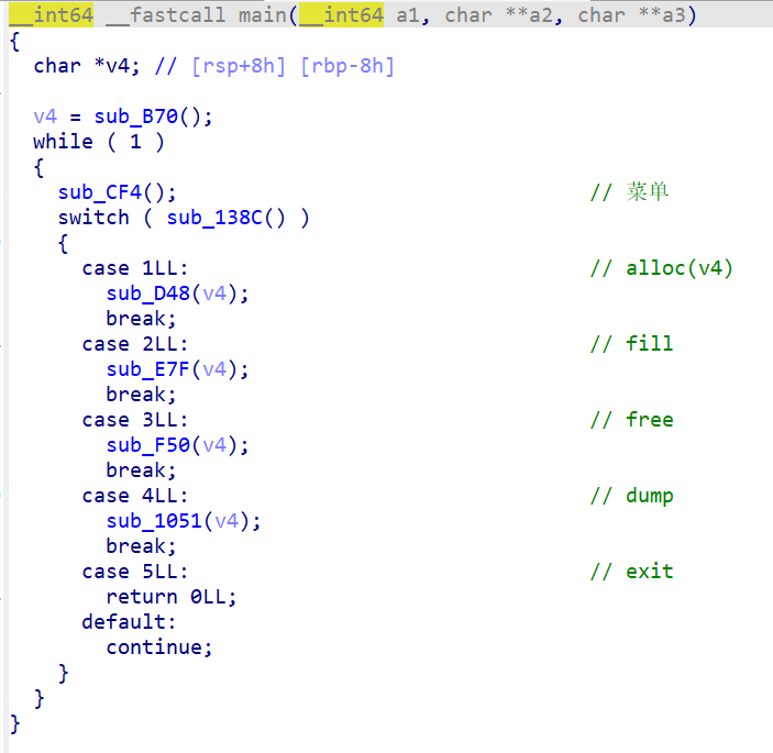 IDA main 1 2 3 4 5 6 7 8 9 10 11 12 13 14 15 16 17 18 19 20 21 22 23 24 25 26 27 28 29 30 31 32 void __fastcall __noreturn main (int a1, char **a2, char **a3) { setvbuf(stdin , 0LL , 2 , 0LL ); setvbuf(stdout , 0LL , 2 , 0LL ); setvbuf(stderr , 0LL , 2 , 0LL ); alarm(0x3Cu ); while ( 1 ) { switch ( (unsigned int )sub_400A1B() ) { case 1u : add(); break ; case 2u : show(); break ; case 3u : edit(); break ; case 4u : delete(); break ; case 5u : puts ("Bye~" ); exit (0 ); case 6u : exit (0 ); default : continue ; } } }