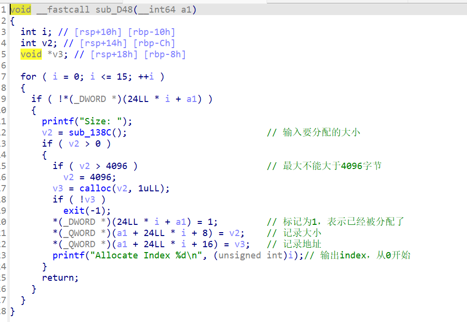add 1 2 3 4 5 6 7 8 9 10 11 12 13 14 15 16 17 18 19 20 21 22 23 24 int add () { int i; __int64 size; void *v3; for ( i = 0 ; i <= 6 && *(&ptr + i); ++i ) ; if ( i == 7 ) puts ("Note is full, add fail" ); puts ("Input the length of the note content:(less than 1024)" ); size = sub_4009B9(); if ( size < 0 ) return puts ("Length error" ); if ( size > 0x400 ) return puts ("Content is too long" ); v3 = malloc (size); puts ("Input the note content:" ); sub_4008DD((__int64)v3, size, 10 ); *(&ptr + i) = v3; qword_6020C0[i + 8 ] = size; qword_6020C0[0 ] = (__int64)*(&ptr + i); return printf ("note add success, the id is %d\n" , (unsigned int )i); }