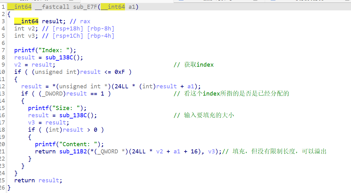 可以看到程序并没有对我们输入的填充长度进行检查,所以漏洞在堆溢出