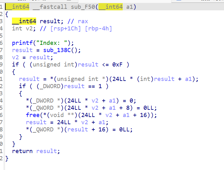 delete 1 2 3 4 5 6 7 8 9 10 11 12 13 14 15 16 17 18 19 20 21 22 23 24 25 26 27 28 unsigned __int64 delete_heap () { int v1; char buf[8 ]; unsigned __int64 v3; v3 = __readfsqword(0x28u ); printf ("Index :" ); read(0 , buf, 4uLL ); v1 = atoi(buf); if ( (unsigned int )v1 >= 0xA ) { puts ("Out of bound!" ); _exit(0 ); } if ( *(&heaparray + v1) ) { free (*((void **)*(&heaparray + v1) + 1 )); free (*(&heaparray + v1)); *(&heaparray + v1) = 0LL ; puts ("Done !" ); } else { puts ("No such heap !" ); } return __readfsqword(0x28u ) ^ v3; }