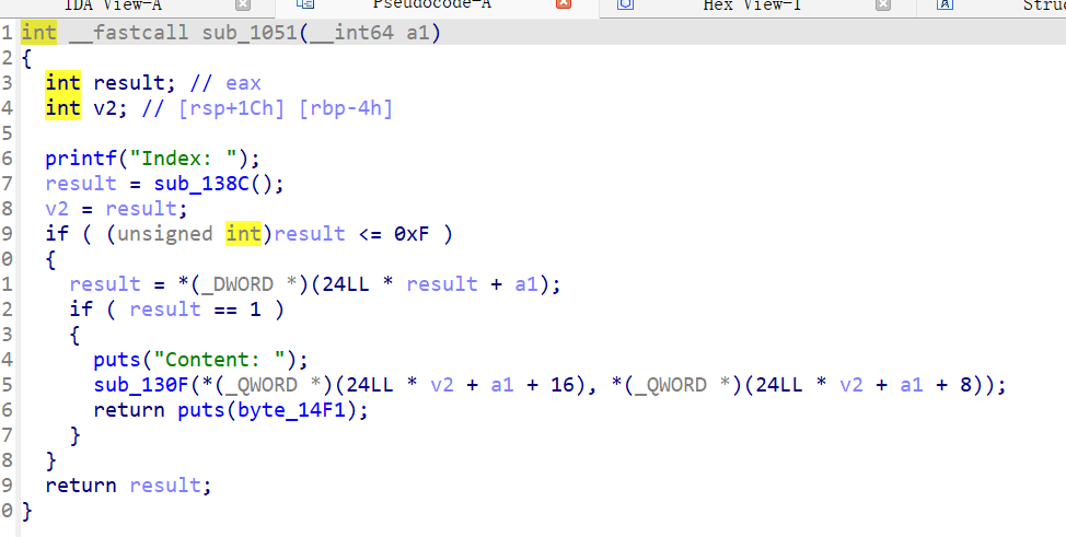 1 2 3 4 5 6 7 8 9 10 11 12 13 14 15 16 17 18 19 20 21 22 23 int edit_heap () { unsigned int v1; char buf[4 ]; size_t v3; printf ("Index :" ); read(0 , buf, 4uLL ); v1 = atoi(buf); if ( v1 >= 0xA ) { puts ("Out of bound!" ); _exit(0 ); } if ( !heaparray[v1] ) return puts ("No such heap !" ); printf ("Size of Heap : " ); read(0 , buf, 8uLL ); v3 = atoi(buf); printf ("Content of heap : " ); read_input((void *)heaparray[v1], v3); return puts ("Done !" ); }