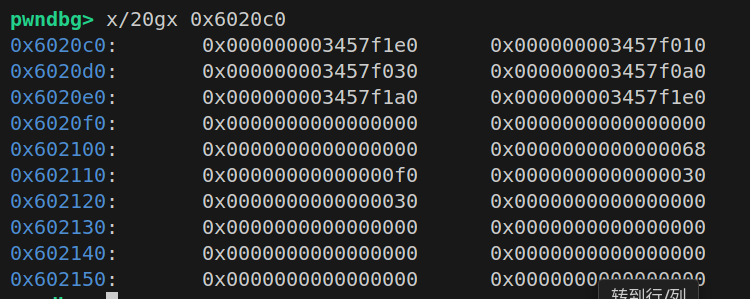 接着free(1),再allocate(0x60),将1回来,这一步目的是将1的大小覆盖到2的一部分来泄露链表头地址,但由于这里的allocate执行的是calloc,会将堆数据清零,我们需要在此补充数据0x111来恢复chunk2,接着free(2),再dump(1),就能将fd,bk泄露出来,也就是unsortedbin链表头地址,但由于这里的allocate执行的是calloc,会将堆数据清零,我们需要在此补充数据0x111来恢复chunk2,此时需要额外申请一个chunk隔开top chunk