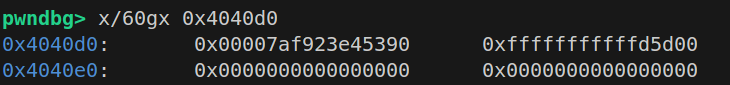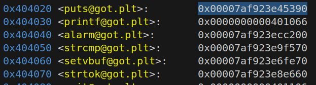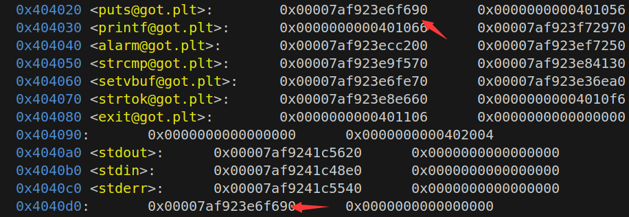 1 2 3 4 5 6 7 8 9 10 11 12 13 0x404020 <puts@got.plt>: 0 x0000000000401046 0 x0000000000401056 0x404030 <printf@got.plt>: 0 x0000000000401066 0 x00007ffff7972970 0x404040 <alarm@got.plt>: 0 x00007ffff78cc200 0 x0000000000401096 0x404050 <strcmp@got.plt>: 0 x00000000004010a6 0 x00007ffff7884130 0x404060 <setvbuf@got.plt>: 0 x00007ffff786fe70 0 x00000000004010d6 0x404070 <strtok@got.plt>: 0 x00000000004010e6 0 x00000000004010f6 0x404080 <exit@got.plt>: 0 x0000000000401106 0 x0000000000000000 0x404090 : 0 x0000000000000000 0 x0000000000402004 0x4040a0 <stdout>: 0 x00007ffff7bc5620 0 x0000000000000000 0x4040b0 <stdin>: 0 x00007ffff7bc48e0 0 x0000000000000000 0x4040c0 <stderr>: 0 x00007ffff7bc5540 0 x0000000000000000 0x4040d0 : 0 x0000000000000000 0 x0000000000000000 0x4040e0 : 0 x0000000000000000 0 x0000000000000000