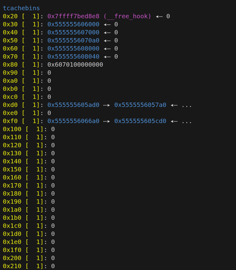 1 2 3 4 5 6 7 8 9 10 11 12 13 14 15 typedef struct tcache_entry { struct tcache_entry *next ; } tcache_entry;typedef struct tcache_perthread_struct { char counts[TCACHE_MAX_BINS]; tcache_entry *entries[TCACHE_MAX_BINS]; } tcache_perthread_struct;